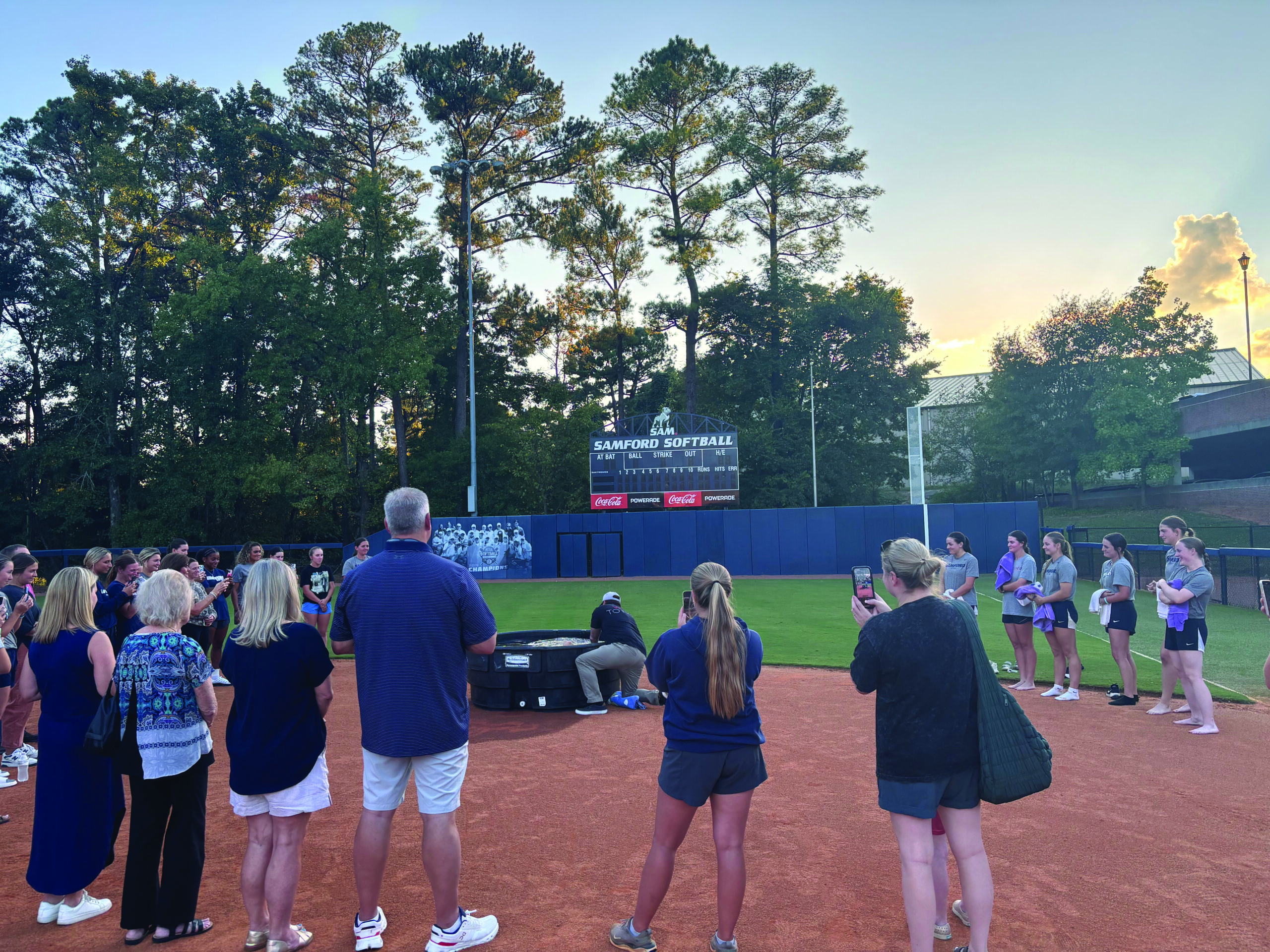 “We really never thought about doing it on the field until I started thinking, ‘Well, we don’t have a pool, and we can’t get in the fountain’,” said Coach Megan Curry.